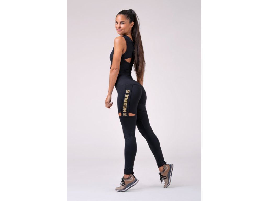 NEBBIA prináša neprehliadnuteľný Honey Bunny crop top, ktorý podporí Vaše sebavedomie hneď ako si ho oblečiete. Rafinovaný dizajn s prestrihmi a NEBBIA lampasovými pásmi pôsobí veľmi žensky a príťažlivo. Buďte odvážne a zažiarte v luxusnej kombinácii čiernej a zlatej farby. Využite Honey Bunny crop top na tréning, na hodiny tanca alebo v ňom vybehnite do mesta. V každej situácii sa v ňom budete cítiť skvelo.